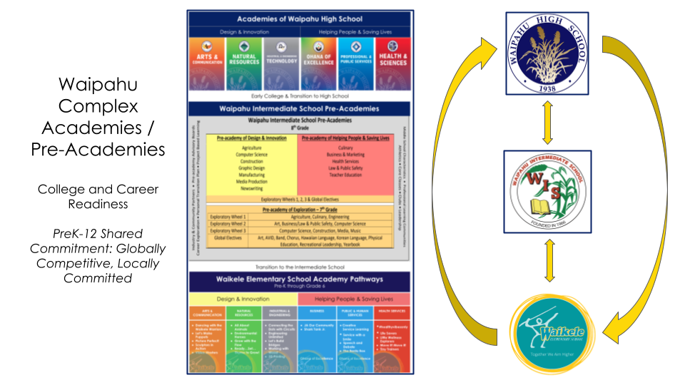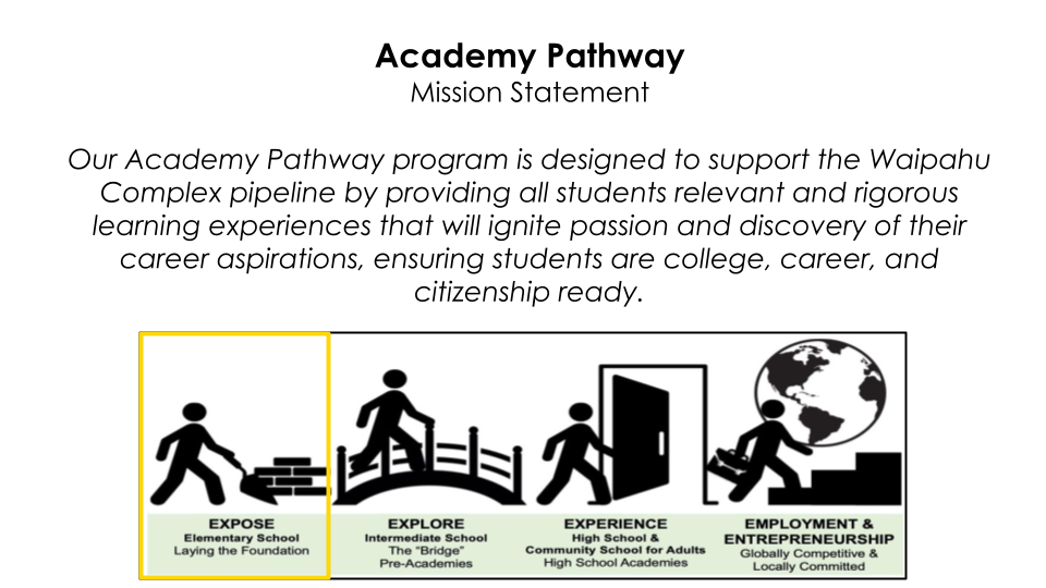 Our Academy Pathway (AP) program fully integrates career and technical education into our school design. The intentional alignment to Hawaii’s Career Pathway Program provides students with college and career learning experiences through elective courses typically reserved for secondary level students. The AP program is centered on exposure, exploration, and discovery, to spark and shape our students' passion" to align with the Waipahu Complex Pre-Academy alignment. Student voice is clearly evident, as students select to join one of the relevant, innovative classes based on their interests and aspirations. Students take the RIASEC test to help determine their strengths and areas of interests, and a career fair is held to expose students to a variety of career options. This unique AP program features multi-age classes, which provides equity and access to each student and advances our mission by supporting our school's vision.
